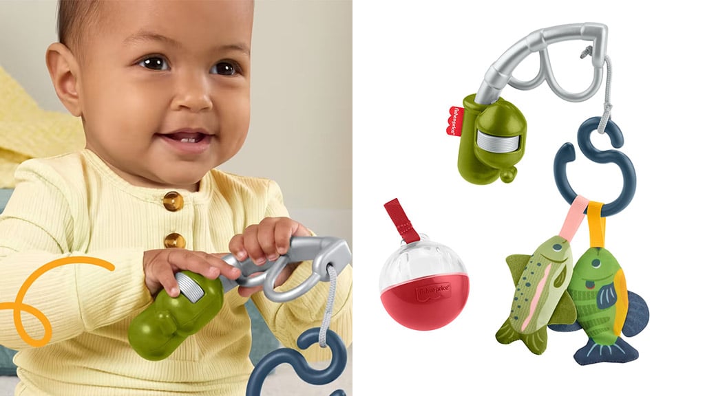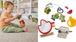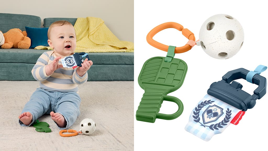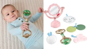 Babies can tackle their motor skills with the Tiny Tailgater and Let’s Play Pickleball sets, each with sensory, teeth-safe sporting gear. The 6-piece DJ Gift Set features kid-friendly disc jockey dupes, including a mirrored laptop, a squeaker microphone, a disco ball rattle, and a teether record with a crinkling sleeve. Copycat campers can fish for fun with the Camp & Crinkle or Reel Fun Fishing sets, while glampers can GRWM like a grown-up with a rattle face roller, clacker cucumber slices, chewy teether gua sha, double-sided crinkle face mask, and more.