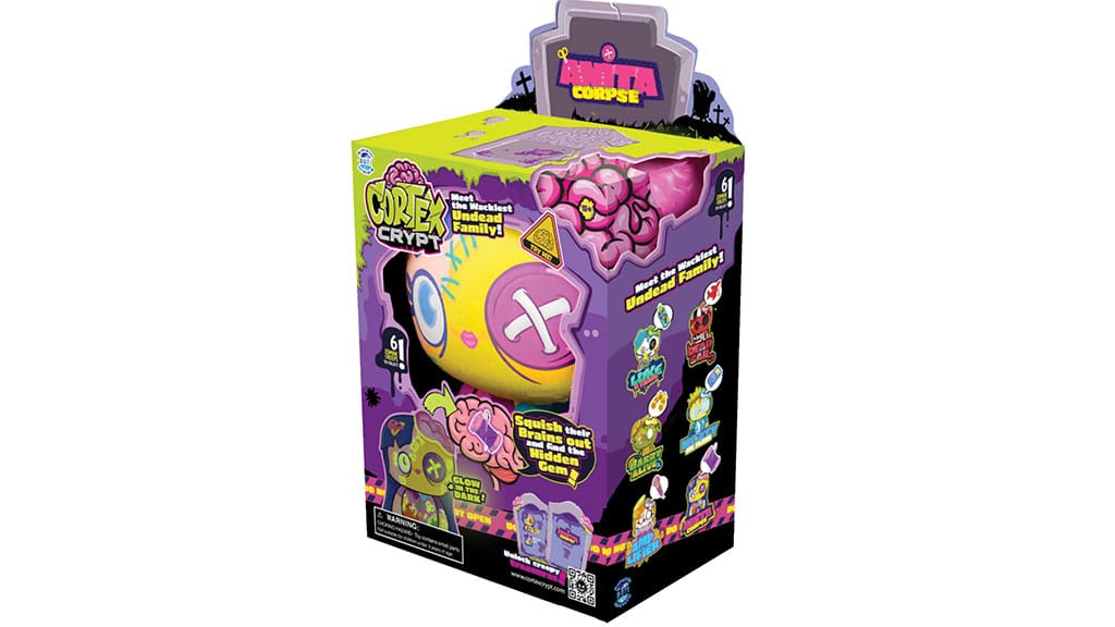 This 8-inch plush features cozy fabric, embroidered face details, and glow-in-the-dark eyes. A removable squishy brain adds tactile fun, and each comes with a tombstone card. Six collectible characters complete the spooky set.