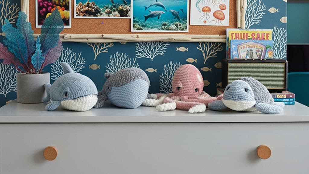 These 14-inch knitted sea life plush figures feature soft textures, pastel colors, and huggable designs, offering a unique tactile experience compared with traditional fur plush for comforting, squeezable play.