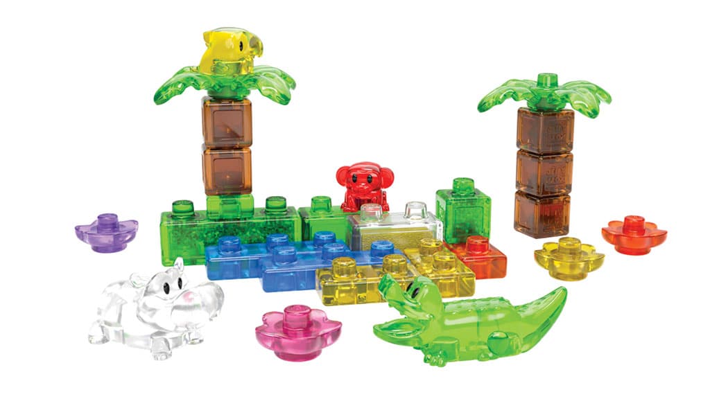 Kids explore and create with this 25-piece building kit. It includes four animals, six themed blocks, and 15 core blocks. Squishy, sensory-filled pieces encourage stacking and squishing.