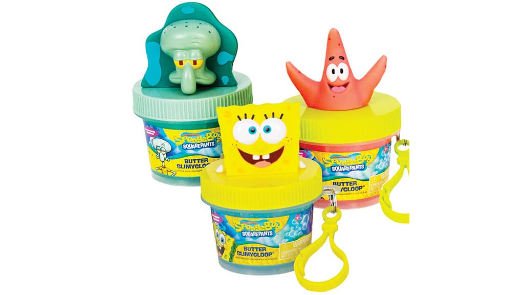 This bundle pack includes three 1.5-ounce jars of scented, stretchy slime with collectible character toppers, including SpongeBob (pineapple-scented), Patrick (bubblegum-scented), and Squidward (cotton candy-scented).