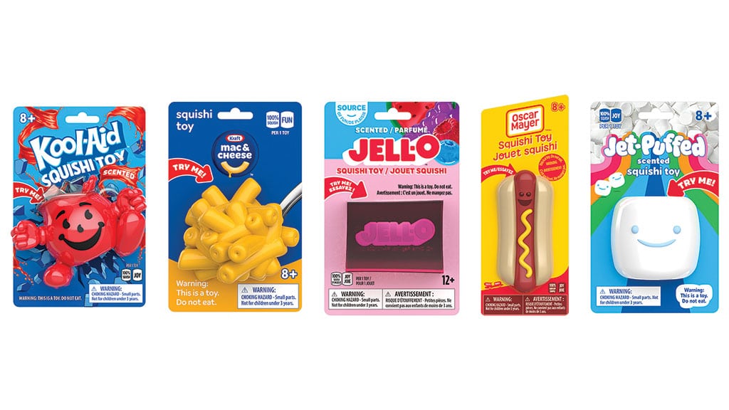 Scented, textured, and squeezable figures offer tactile, collectible fun with favorite food brands like Kool-Aid Man, Jell-O, and Oscar Mayer.