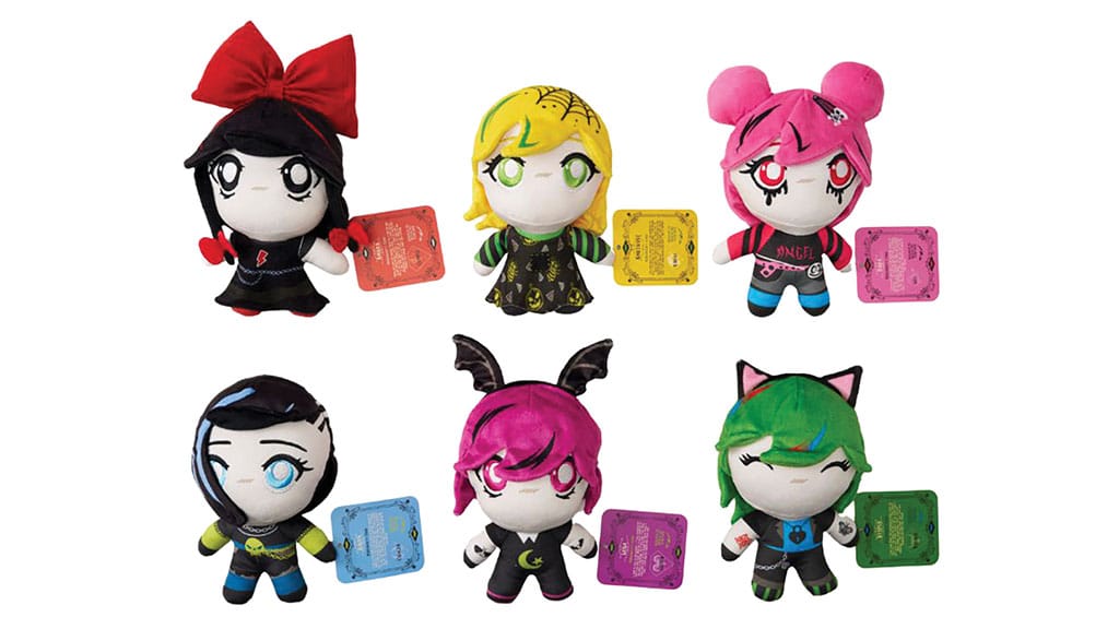 Each fashion-forward character blends soft-sculpt design with goth-cute styling, moody palettes, and irresistible accessories across 4-inch mystery clip-ons and 8-inch plush.