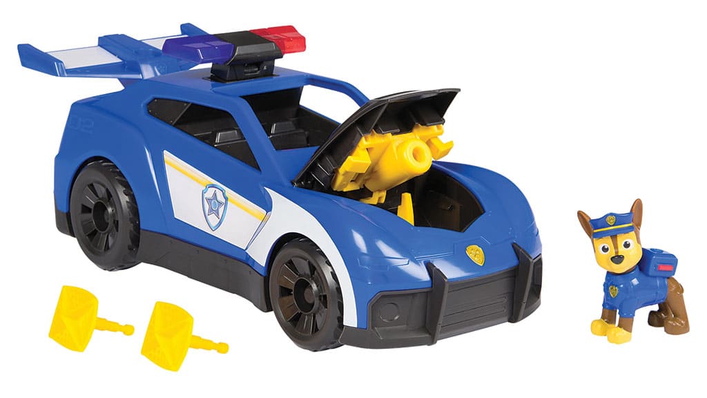 Chase’s 11-inch police cruiser features lights, sound effects, a secret net launcher, and an extendable drone spoiler for action-packed adventures.