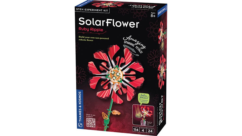 Young engineers design and build motorized flower models with moving petals powered by a solar panel, learning about motors, planetary gears, and solar energy in the process.
