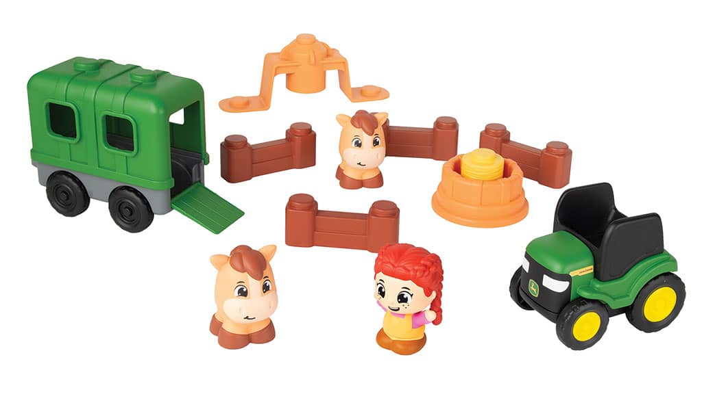 This 15-piece set includes a character figure, horses, a stacking vehicle and trailer, a spinning merry-go-round, stackable fences, and a hay bale feeder.