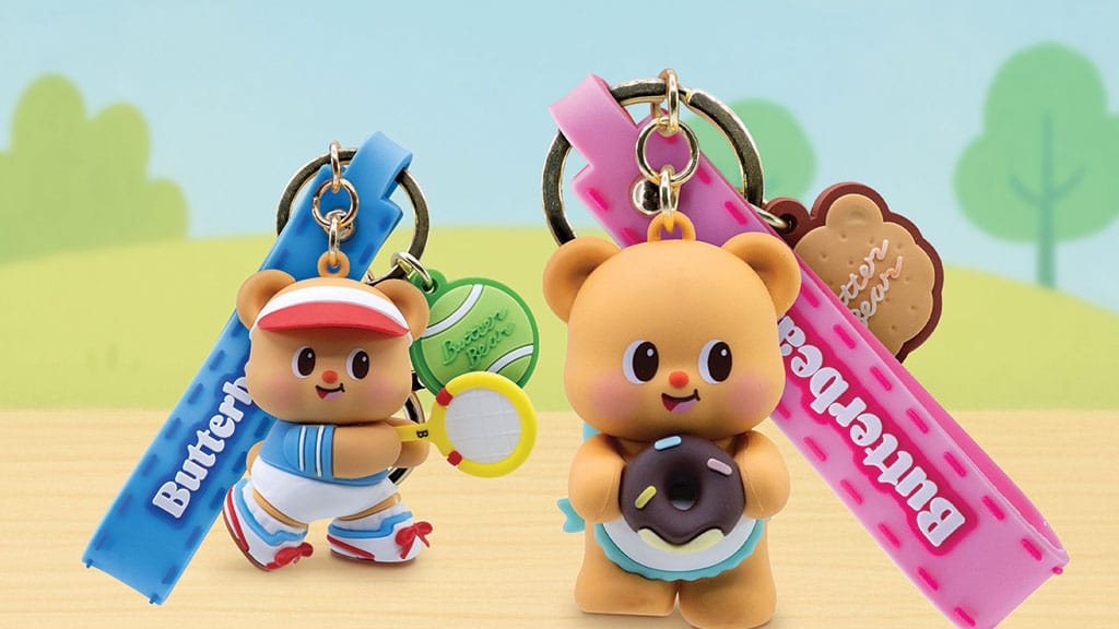 This keychain and strap collection features Butterbear, the Thai-born mascot, as compact, pastel-colored figures in playful daily-life poses, with silicone straps and gold-tone hardware.
