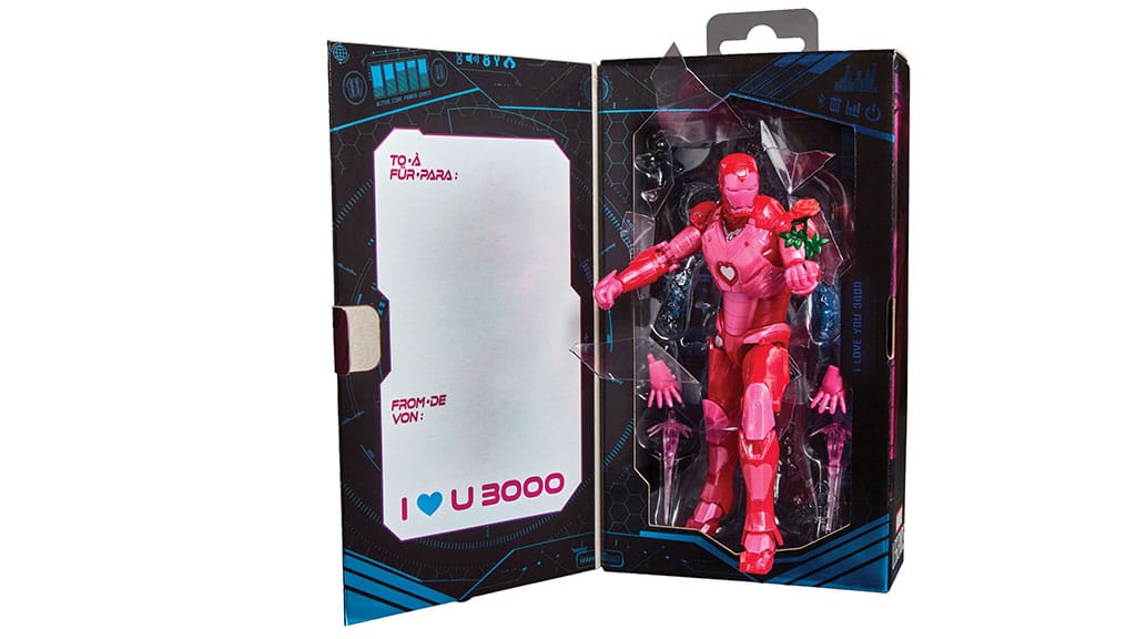 This Valentine’s Day action figure features Iron Man in shades of pink and red. The figure comes with five accessories including alternate hands, blast FX, and a rose. The box opens to reveal a note that can be filled in by gift givers.