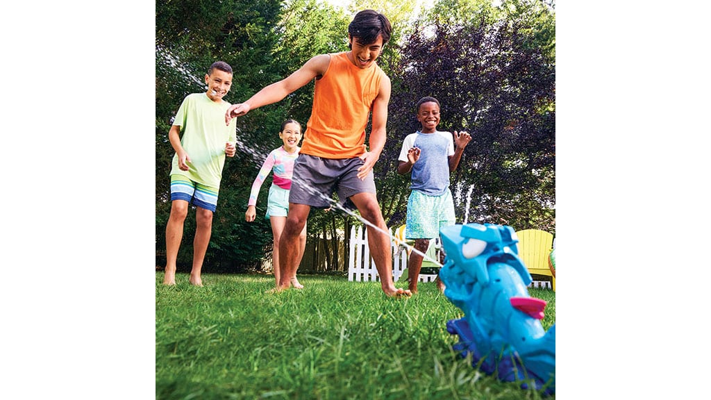 A hose-connected shark with adjustable angles sprays two rotating water streams from chomping jaws for summer fun, encouraging jump-and-dodge or run-through outside play.