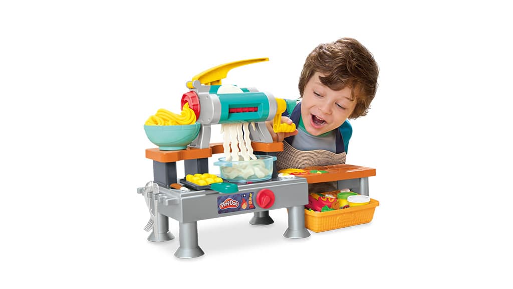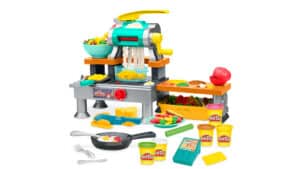 The Play-Doh Super Sizzlin’ Kitchen playset incorporates interactive cookware and sound effects tied to pretend food creations. The Play-Doh Barbie collection will also expand in 2026 with additions including the Designer Pattern Studio.