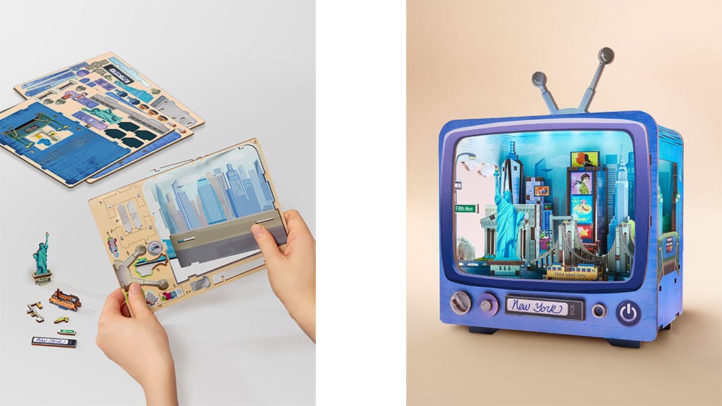 Arkitec is launching with two waves: CityVision and Miniscapes. CityVision features 3D puzzles recreating iconic city skylines, including those of New York City and Paris. Each set comes in a displayable TV box with LED lights and dual-sided cutouts, perfect for display. Miniscapes bring lifestyle scenes and moments, such as a bustling shopping center, to life with moving parts and lights. Each set comes with batteries and a USB-C charging cable.