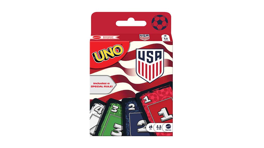 Mattel extends the spirit of competition to game night with the UNO U.S. Men’s National Team deck, which includes Red and Yellow penalty cards. The new cards turn action cards into penalty cards for heightened play. The deck arrives on shelves next month.