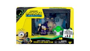 The Backlot Studio Set includes the three locations, along with additional figures and props. Kids can play pretend as a director with a functional camera dolly, designed for a phone. The Minions Quest for Monsters Set includes a spell book, water, a magic potion, and a secret button that work together to reveal a monster inside a frozen mountain.