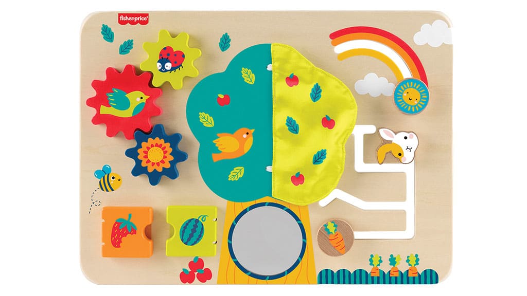 This wooden board features six engaging development activities for little ones. They can spin gears, flip doors, play with a crinkle panel, and more.