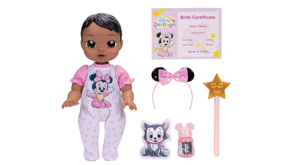 Little ones connect with Disney magic through baby dolls inspired by Minnie Mouse (pictured), Stitch, and more. Each doll has interactive modes, closing eyes, accessories, a plush, and a birth certificate.