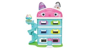 Kids can send three kitty figures down the nursery’s glittery slide, put them in the pushcart, place them in the highchair for meals, and unbox a dollhouse delivery to reveal a surprise toy. The 17-piece playset also includes a 3-inch Gabby figure.