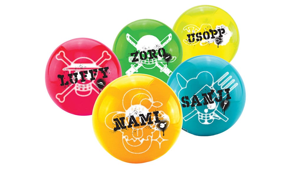 Each kickball features the Jolly Roger symbol and a character from the hit anime One Piece, including fan- favorites like Luffy, Zoro, Nami, Sanji, and Usopp.