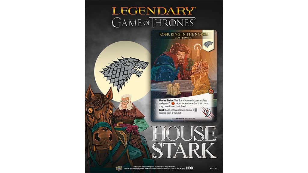 This is the first Legendary title with a player-versus-player format, making it a fun new experience for committed players and new fans alike. In the game, fans will play as one of the Great Houses: the Starks, Targaryens, Lannisters, or Baratheons. Players will use their House’s Masterminds, Defenders, and at least one Ally group and Henchman group. They must choose whether to support their own forces or battle against their enemies and earn Victory Points.